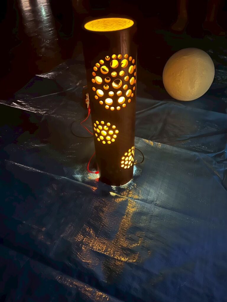 どの灯の色が一番竹灯籠を美しく照らすか、実験も行いました。