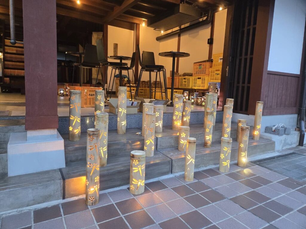 地域の皆さま、圓通寺ご住職さま、市議会議員の皆さまをはじめ、たくさんの方のご協力をいただき、無事に竹灯籠が完成しました。
