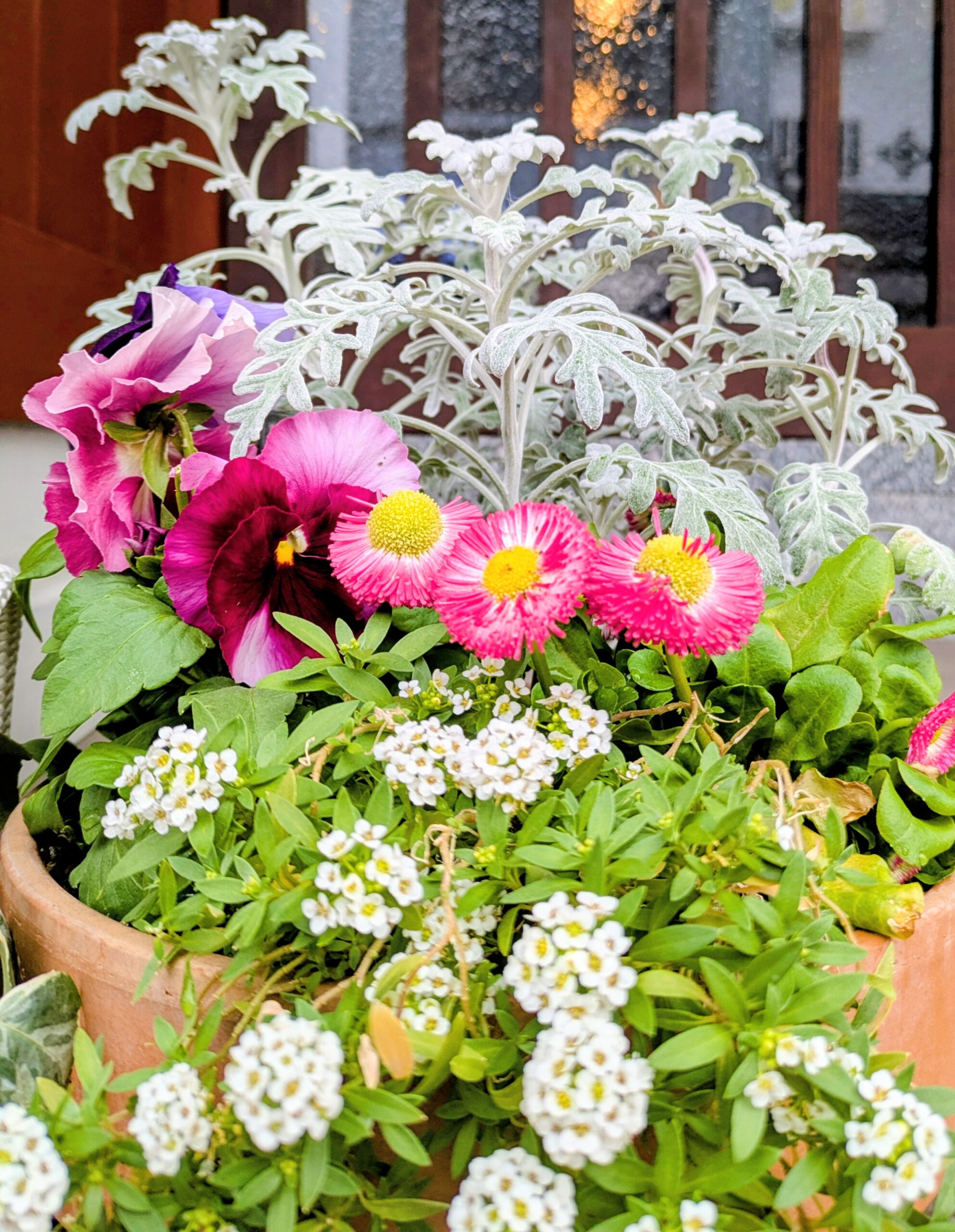 手前の白い小さな花は、アリッサムです。この花も、秋の寄せ植えから移植しても綺麗に花を咲かせてくれています。