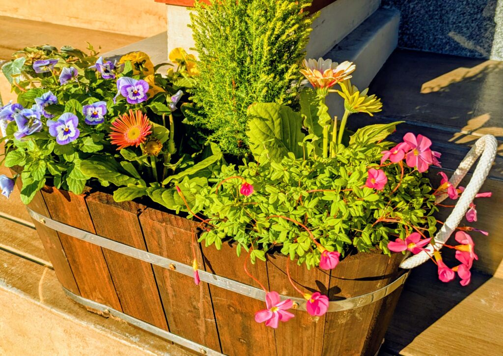 こちらの寄せ植えは、紫や黄色のビオラ、オレンジと白色のガーベラ、右側にはオキザリス・グラブラが咲いています。